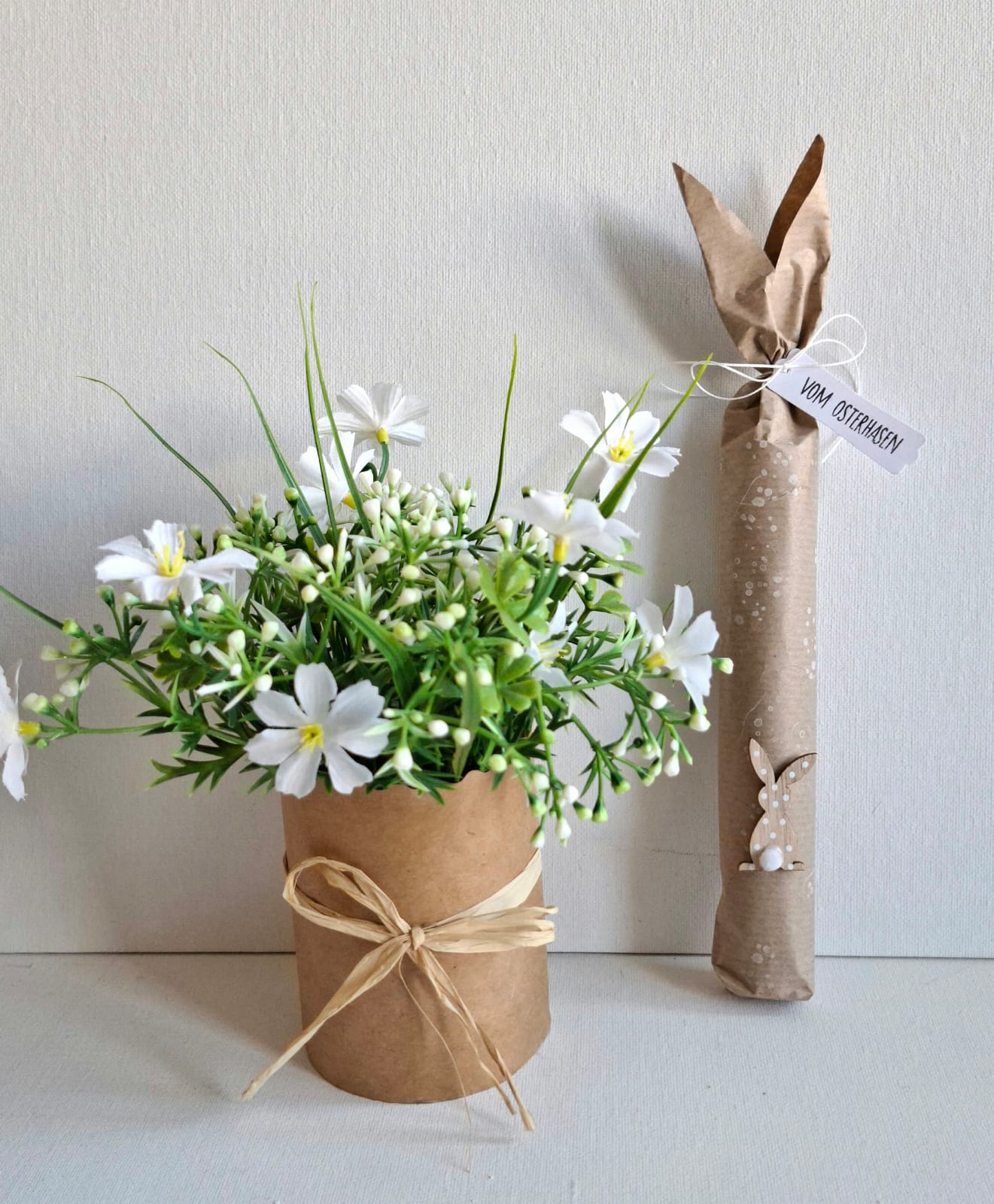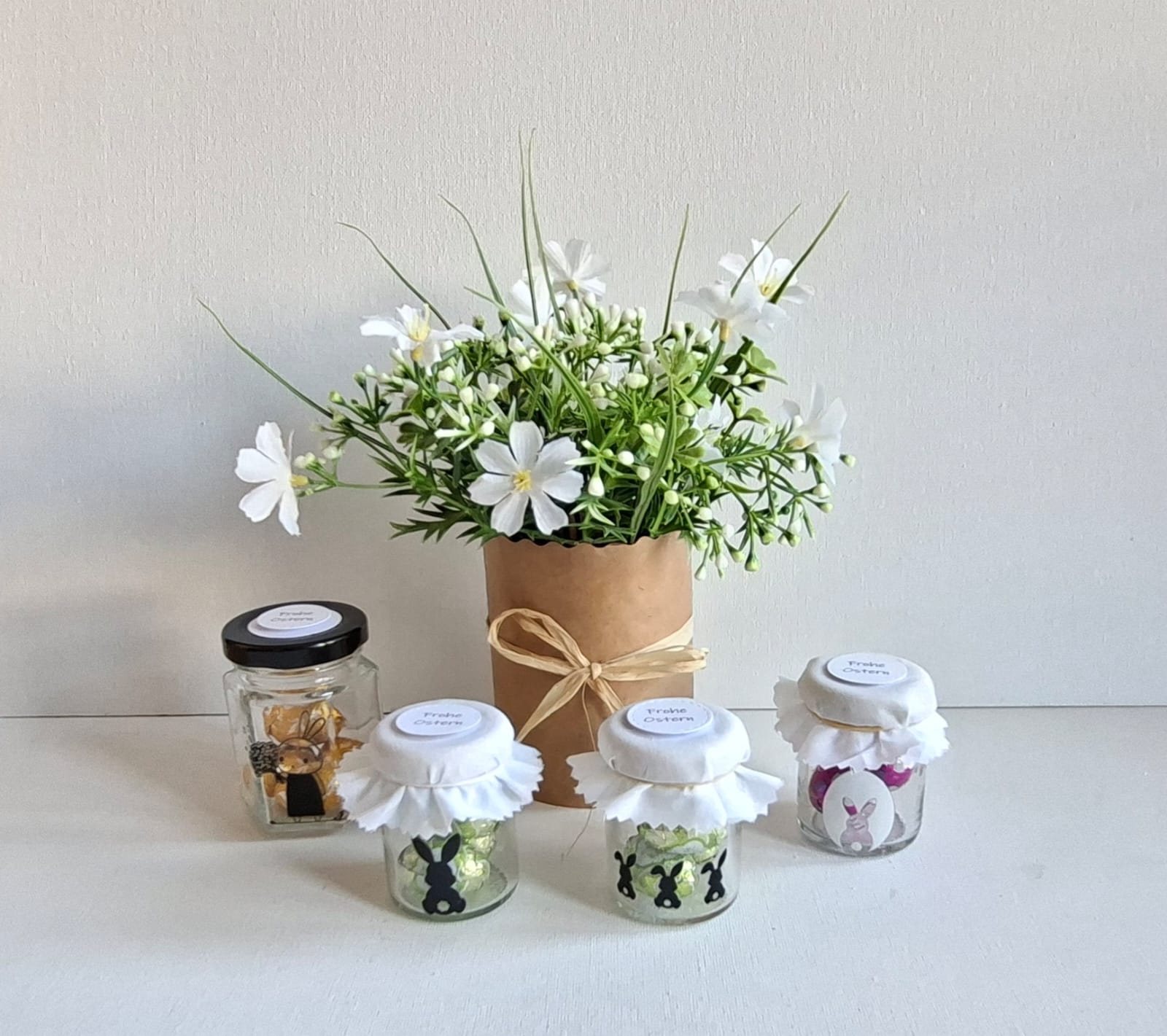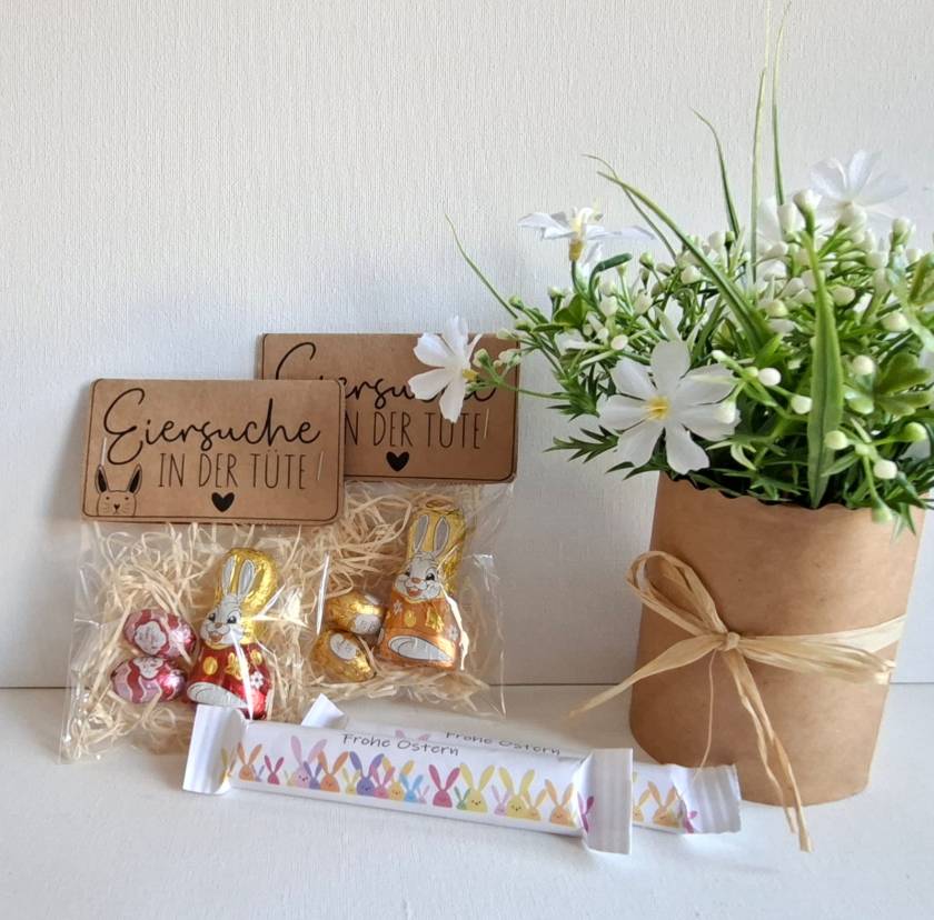Eine österlich verpackte Kerze mit einem Ostergruß auf der Kerze ist auch noch vorrätig.