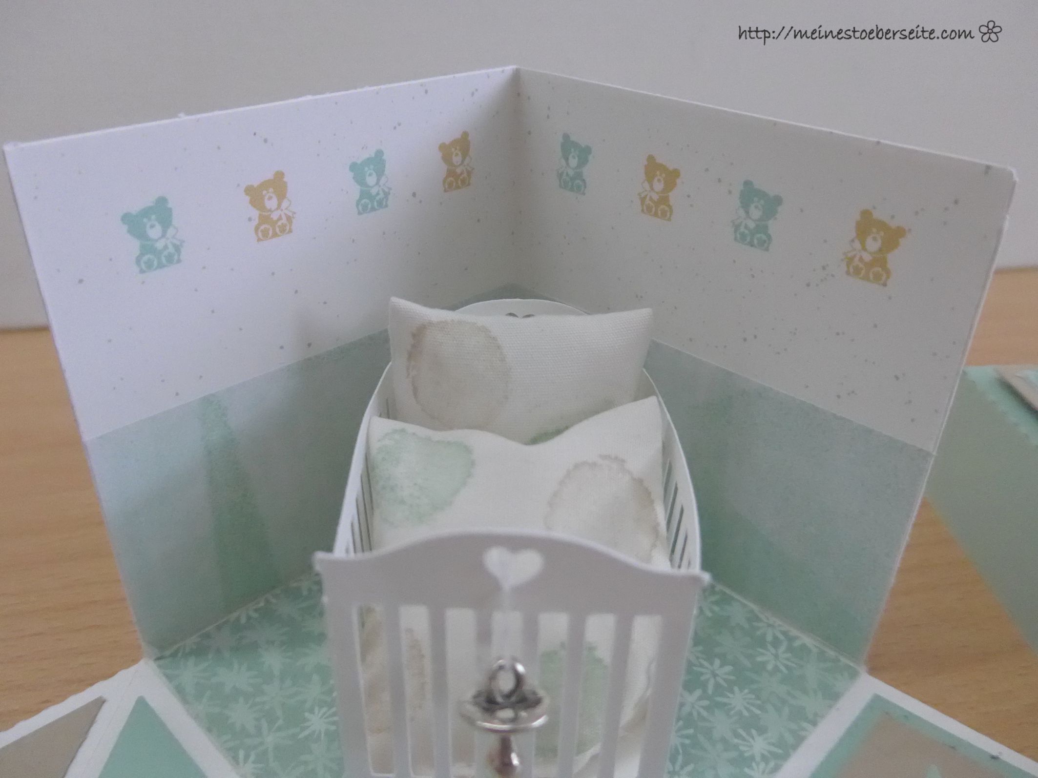 In diesem Fall hatte ich allerdings keine Möglichkeit an Infos über das Kinderzimmer zu gelangen, außer das es für einen Jungen in weiß/mintgrün gestrichen wurde.  Jetzt musste ich mir selber etwas ausdenken, aber ich glaube es ist trotzdem ganz nett geworden …Teddy`s  gehen immer. 😉