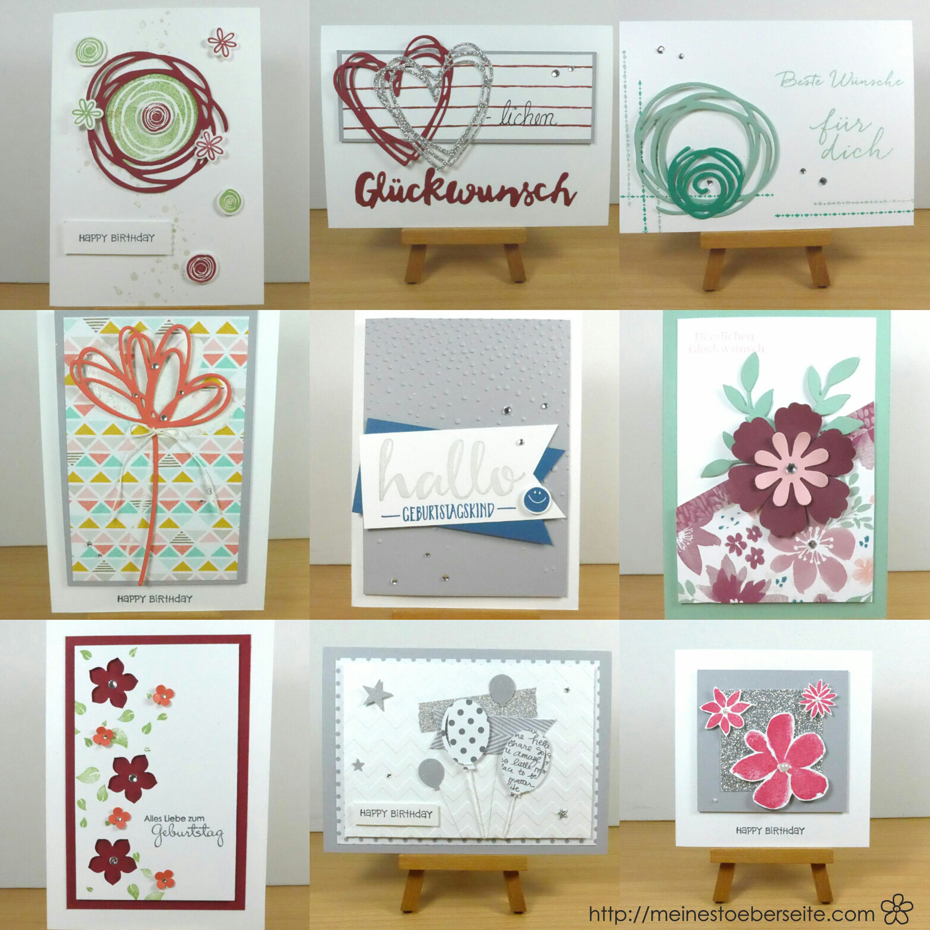 Ich musste auf die Schnelle 8 Geburtstagskarten fertigen und da ich momentan so schnell keine Ideen hatte, habe ich mir Pinterest zu Hilfe genommen. Ich kann jetzt aber nicht mehr genau sagen, von wem so einige Ideen stammen … Sorry… aber dafür habe ich auch nur eine Collage erstellt..man schmückt sich ja nicht so gerne mit fremden Federn. 😉