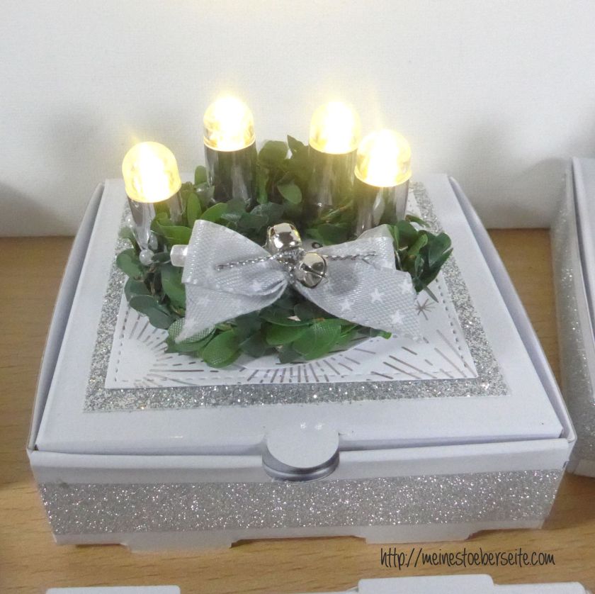 Der Kranz wurde aus künstlichem Buchsbaum gedreht, mit den 4 LED Lichtern bestückt, dekoriert und auf die kleine Pizza Box (9 x 9cm) von Stampin Up geklebt.