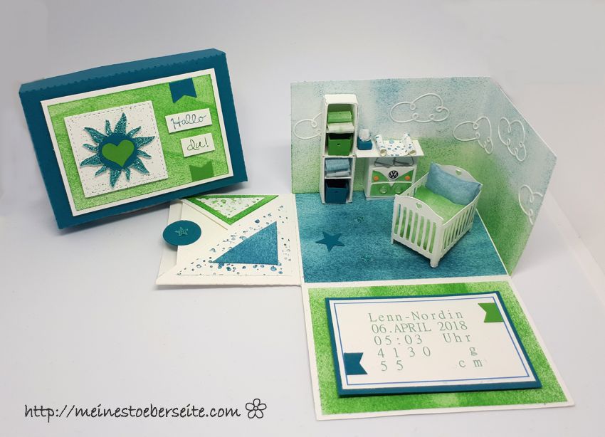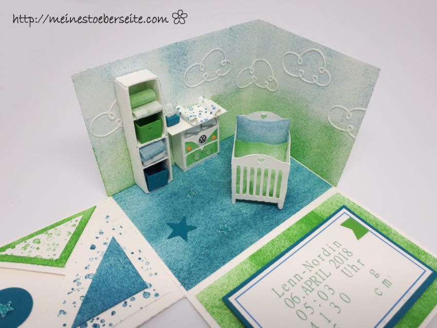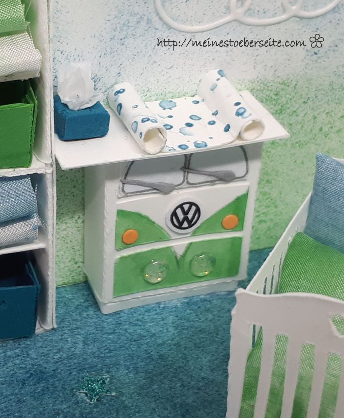 Im Zimmer steht eine selbstgestaltete Bulli Kommode in Weiß/Grasgrün, ansonsten war mir die weitere Einrichtung des Kinderzimmers nicht bekannt und somit konnte ich meinen Ideen freien Lauf lassen.