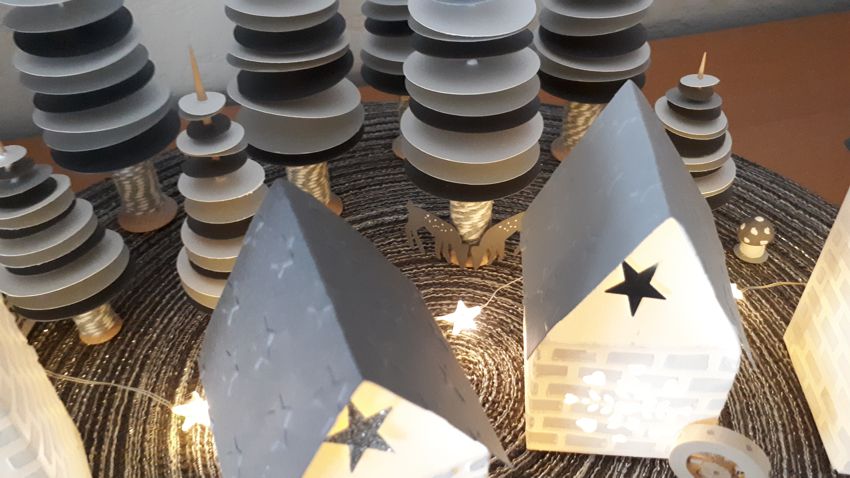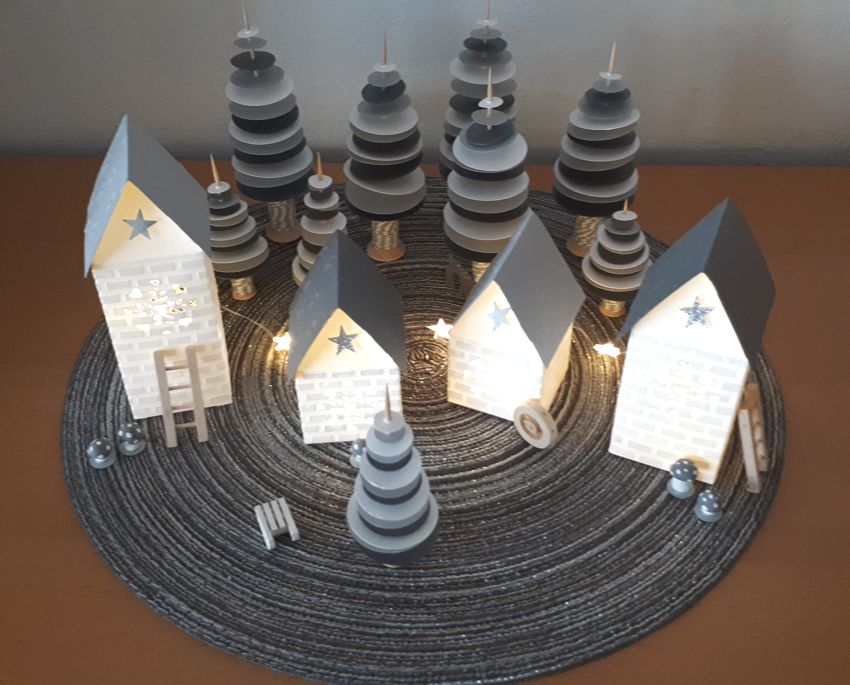 Damit man das kleine Dorf auch in der Dunkelheit gut sehen kann, habe ich in die Rückwand ein Loch gestanzt und eine kleine Lichterkette verlegt.