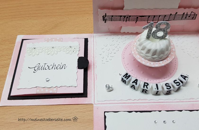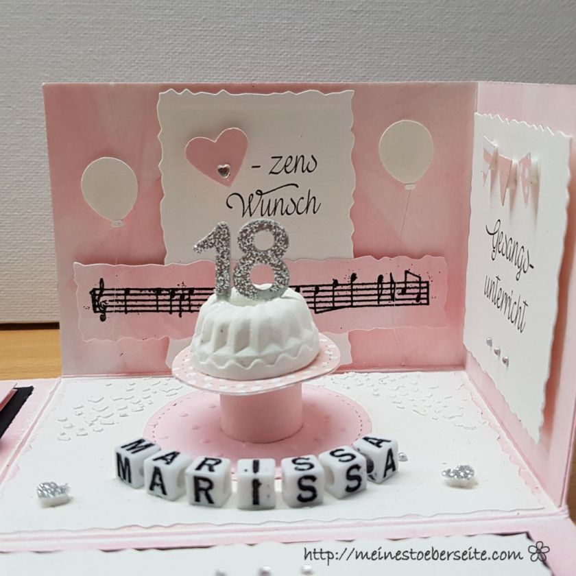 899 Explosion Box zum 18.Geburtstag mit den Vorgaben: Gutschein zum Gesangsunterrricht, Noten, Text und Farben Rosa/Weiß Ich habe jetzt allerdings noch ein wenig schwarz dazugenommen, sonst wäre es evtl eher eine Box zur Geburt geworden. 😄 Gefällt mir Wird geladen …