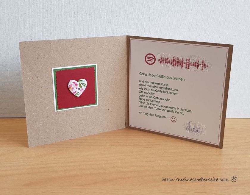 Ich erhielt vor kurzem durch meine Demonstratorin Ilona eine Idee, einen Spotify Code zu verarbeiten, so dass man seinen Lieblingssong immer bei sich haben kann. Vorraussetzung ist natürlich, die Spotify App auf dem Handy.