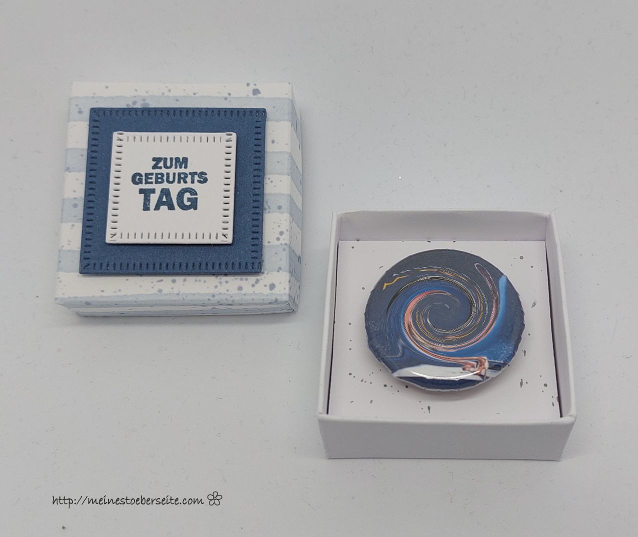 In der Box befindet sich ein passender Button für eine Konzertveranstaltung (Geschenk) … muss ich leider unkenntlich machen … aber sieht gut aus. 😄 😄
