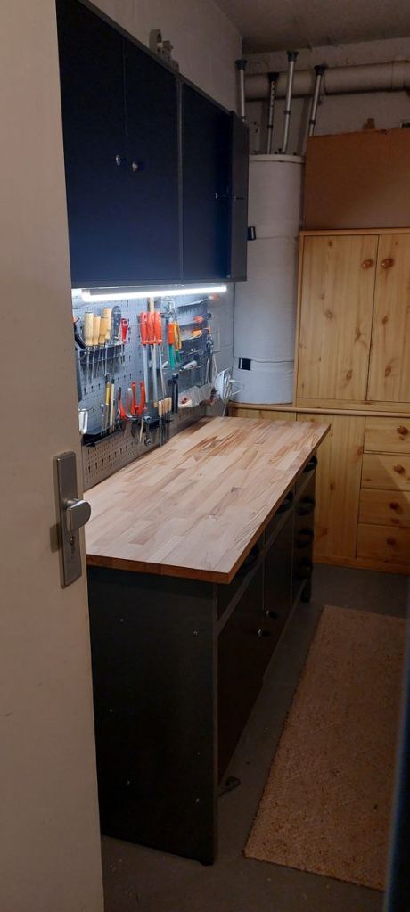 Die Neugestaltung des Kellers hat aber die meiste Zeit in Anspruch genommen. Der Gedanke mit einer Werkbank kam mir mit den zu sägenden Klötzchen oder wenn die Öffnungen in den Raysin Projekten nicht passten und man mal etwas nachschleifen musste. Im Zimmer war es immer eine sehr staubige Angelegenheit.