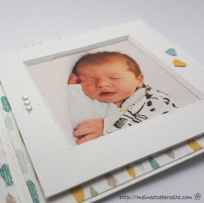 Vorgaben waren: pastellig in Grün, Türkis, Blau, Teddybär, Lokomotive, Bauklötze, Schnuller einen bestimmten Text und ein Foto.