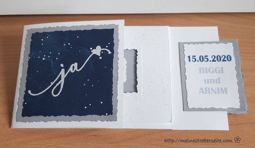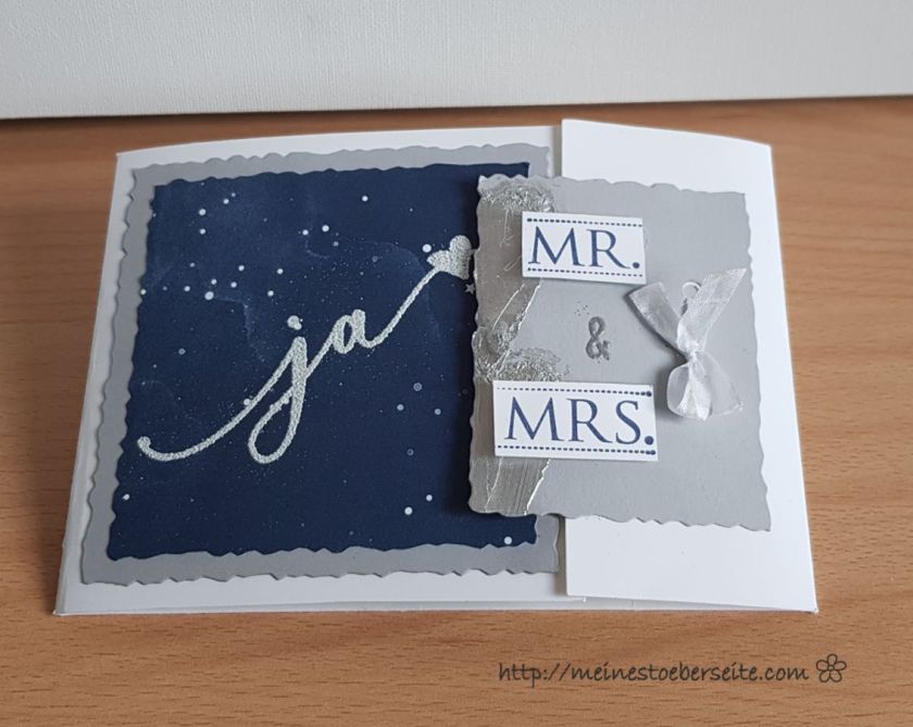 Bei dieser Karte musste ich die Daten des Brautpaares, zwei Themen und ein wenig Text unterbringen und entschied mich, weil ich die Technik ganz nett finde, für eine Wasserfallkarte.
