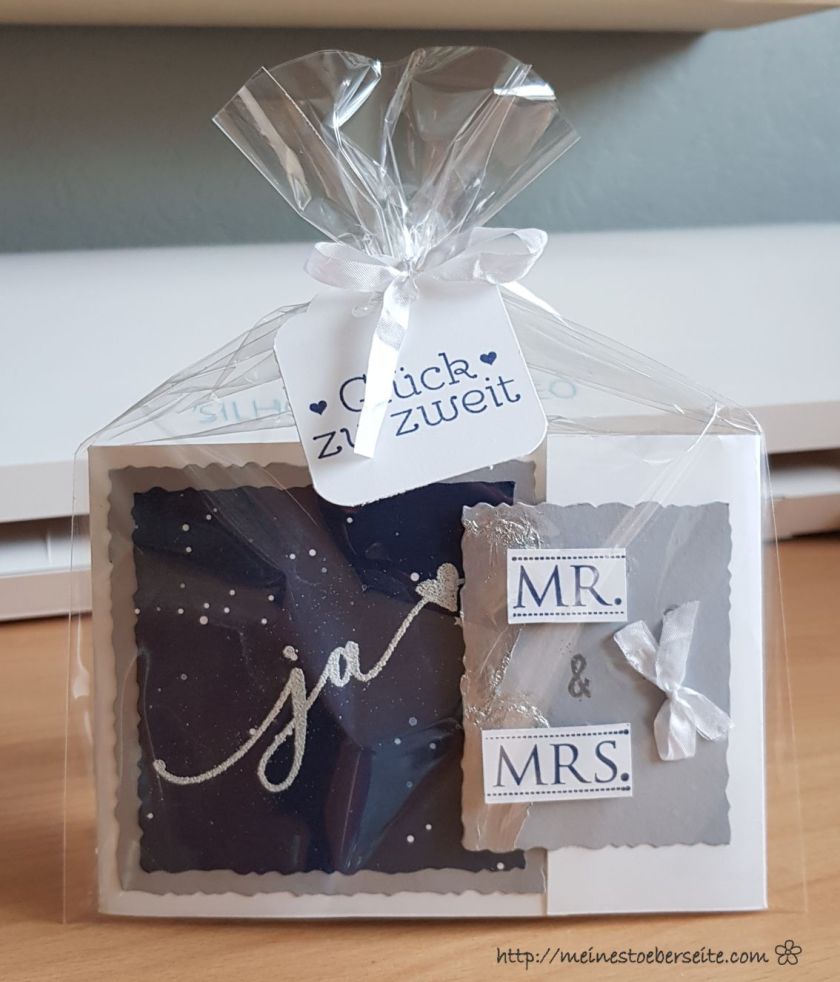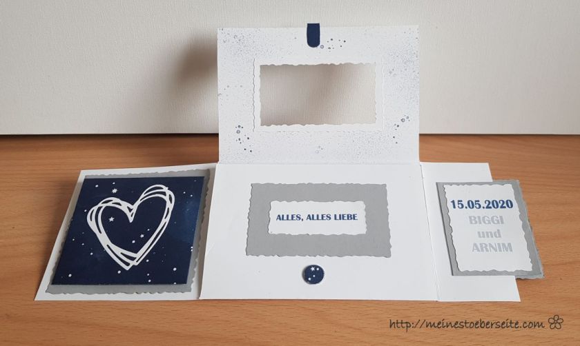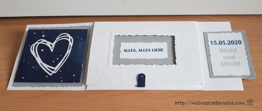 wenn man die Karte mit dem Spruch – Alles, Alles Liebe – aufklappt, dann erscheint in der Mitte eine Möglichkeit für persönliche Worte und darunter erscheinen die Interessen des Brautpaares, aber die sind mal wieder sehr persönlich…deshalb kein Foto.
