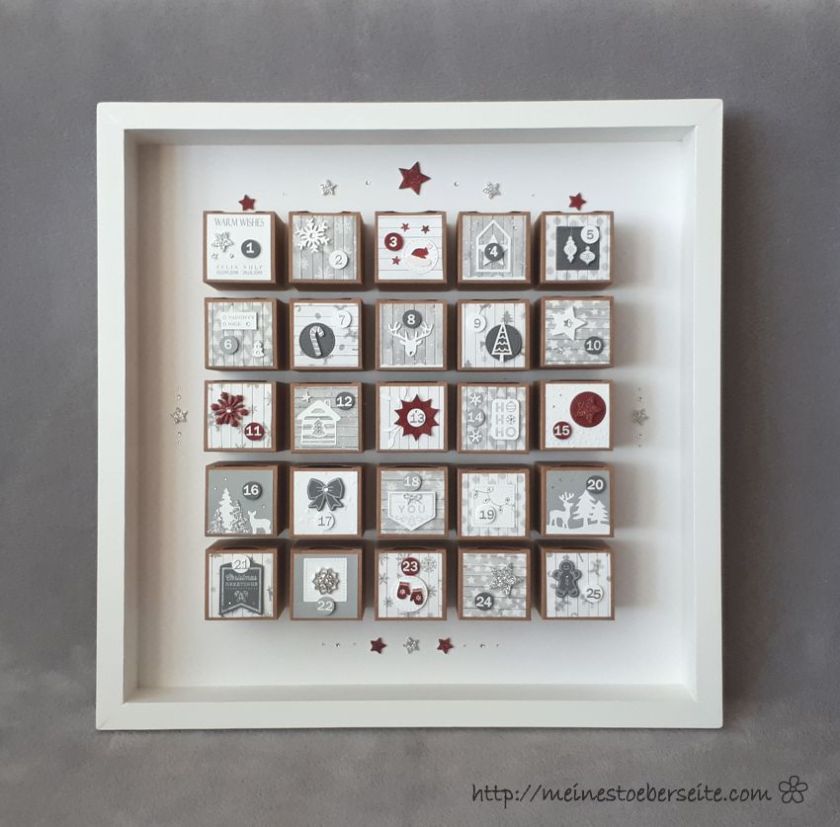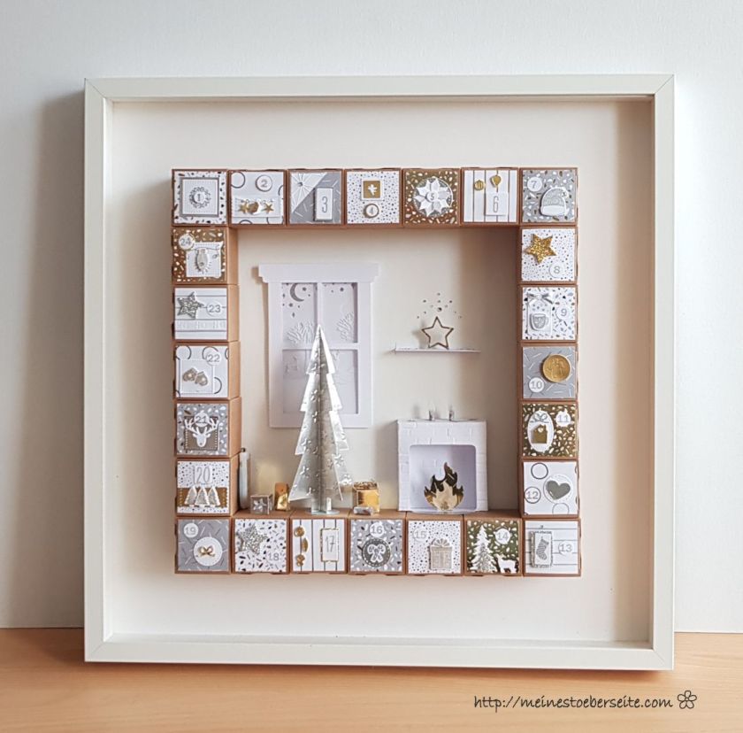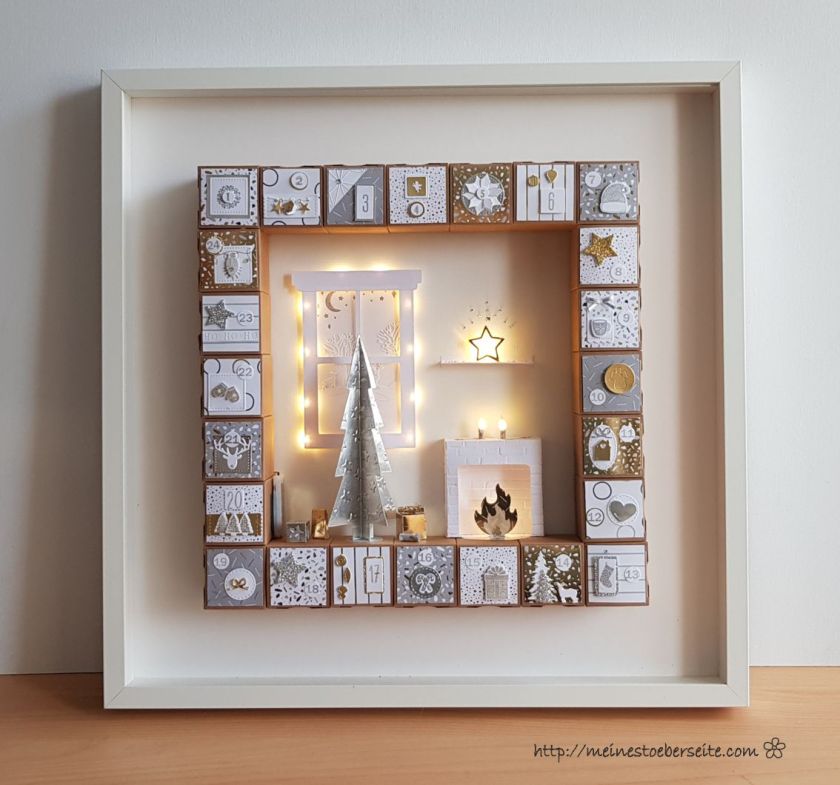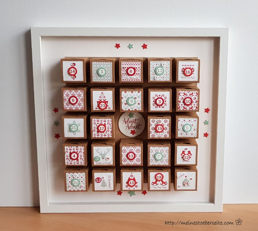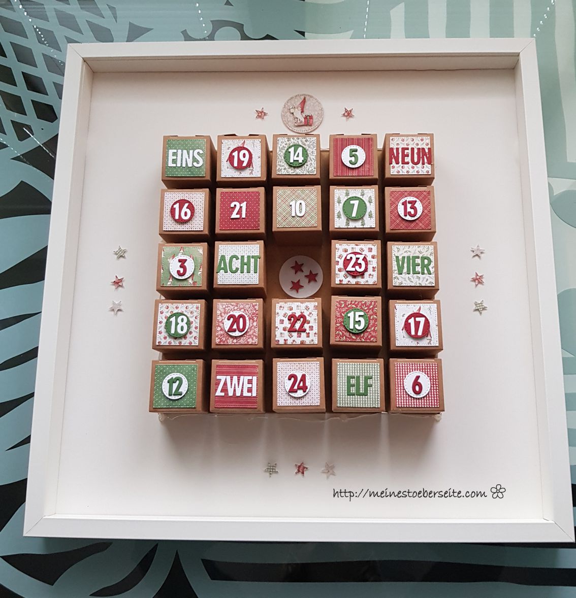 Dieser Adventskalender sollte eigentlich in einem weißen Rahmen gestaltet werden, da er aber nach Canada geschickt werden soll und die Versandkosten ab 2kg Gewicht zu hoch ausfallen würden, musste eine Alternative gefunden werden.