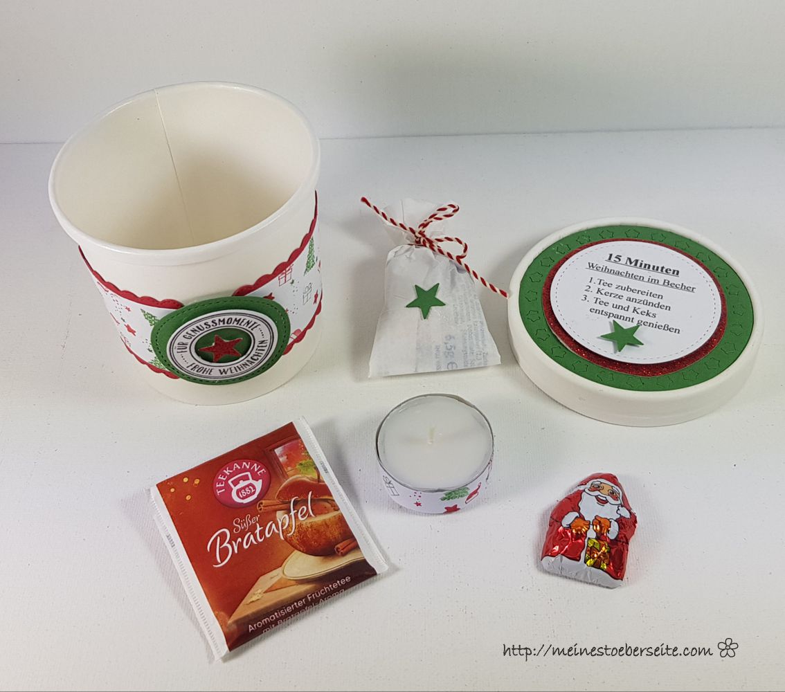 Im Inneren des Bechers befinden sich ein Teebeutel, ein Teelicht, eine kleine Schokofigur und da viele keinen Lebkuchen, Spekulatius u.a.mögen, habe ich mich für ein Mini Keks mit Kakaocreme entschieden.