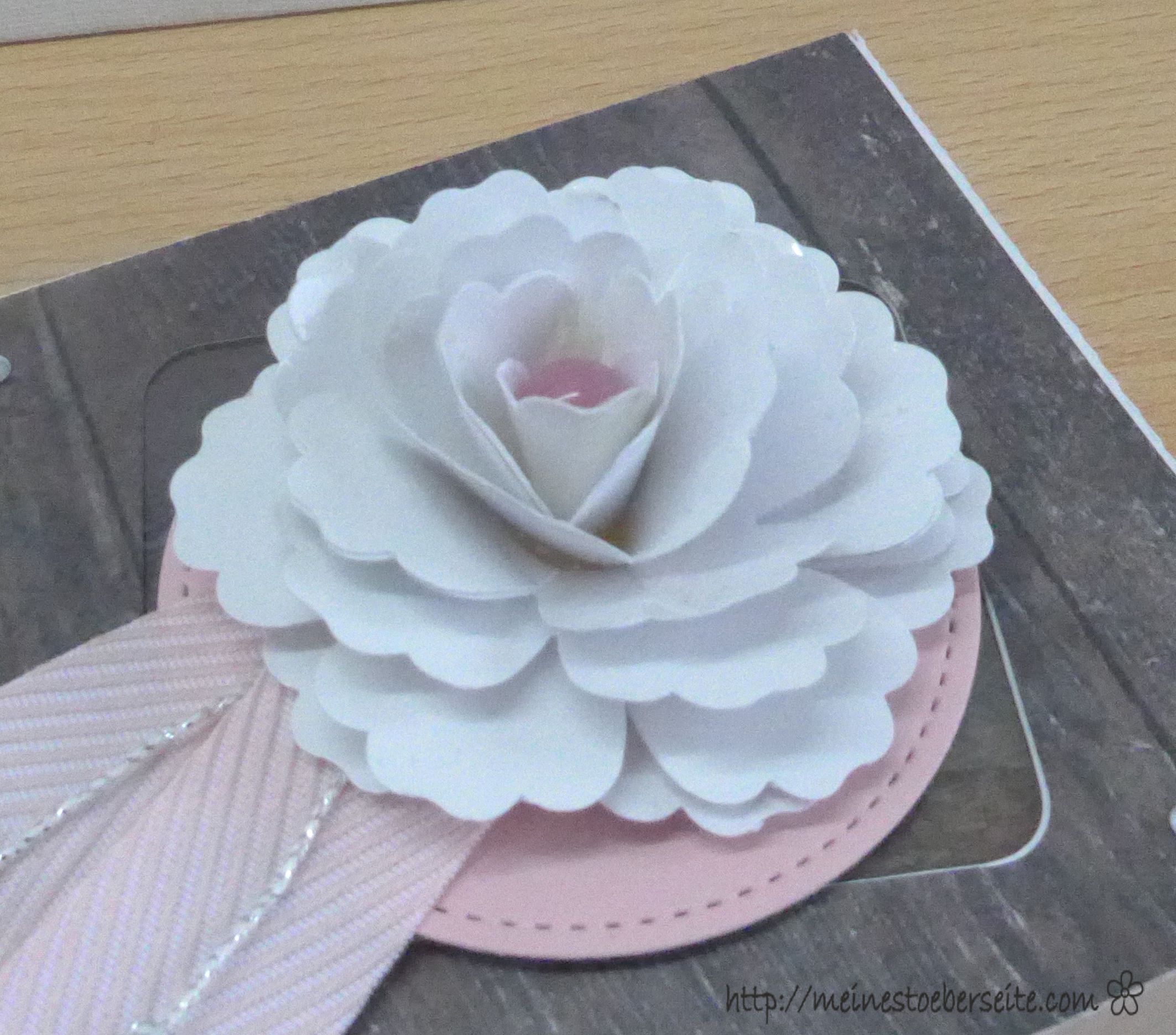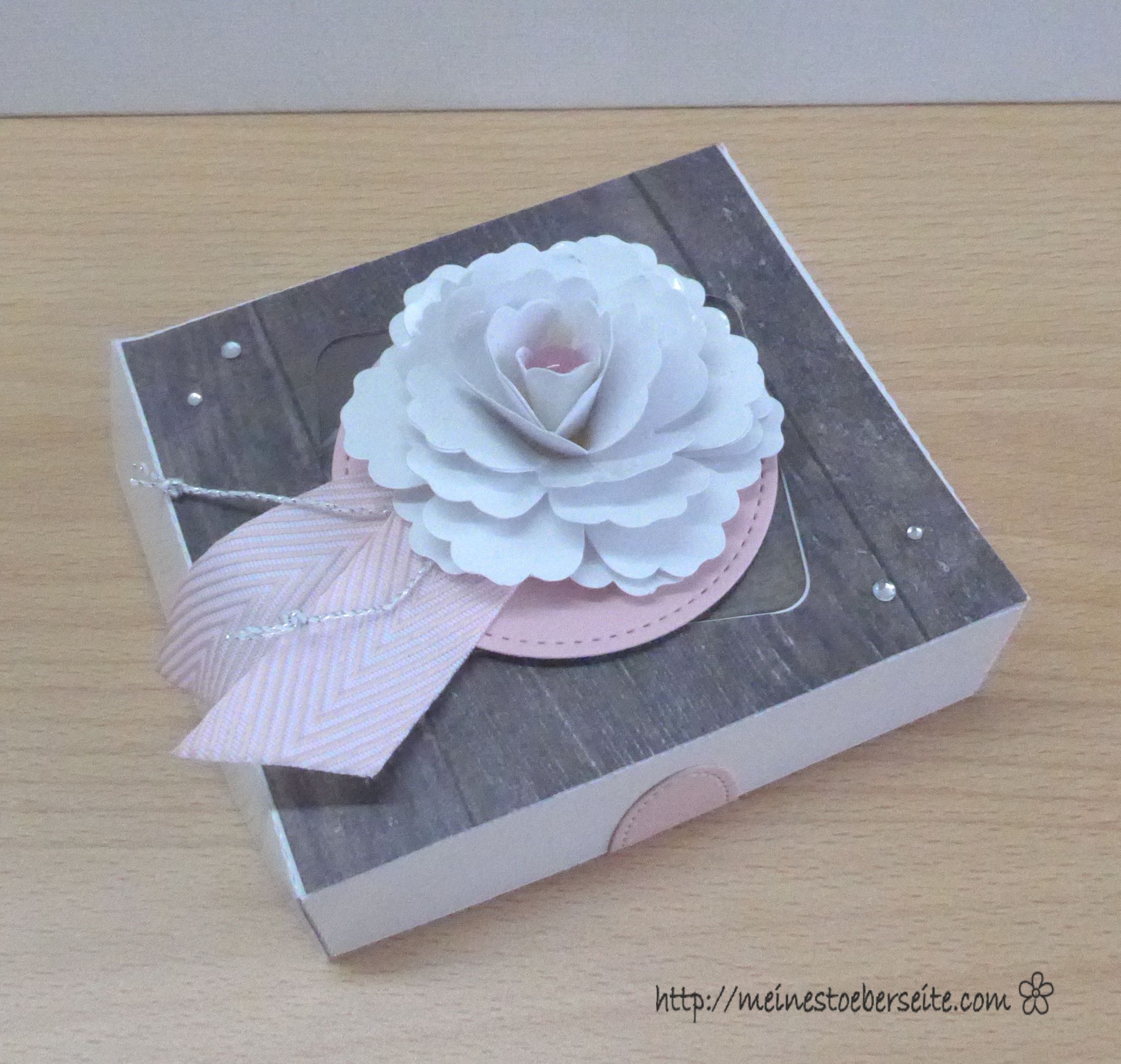 Da das Geburtstagskind vor kurzem neue Möbel bekommen hat und zwar Weiße mit dunklem Holz abgesetzt und als Eyecatcher ein großes Bild mit rosa Blumen, dachte ich mir… in genau diesen Farben fertige ich diese Box.