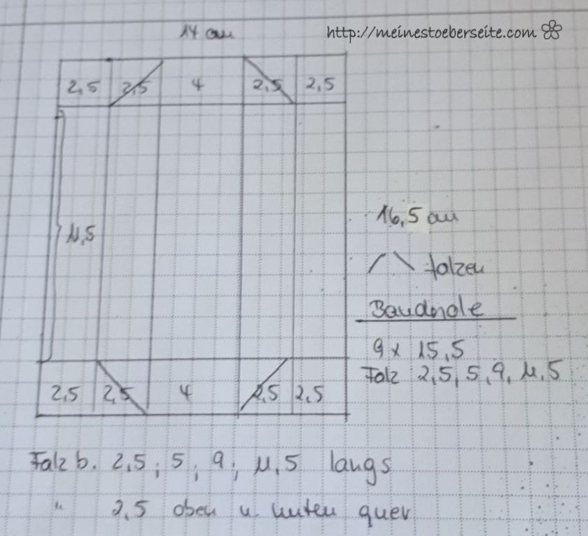 Maße Unterteil: die Hälfte eines DIN A4 Blattes auf 7 1/2 x 5 1/2 inch zurecht schneiden und ringsherum bei 1 1/2 inch falzen.