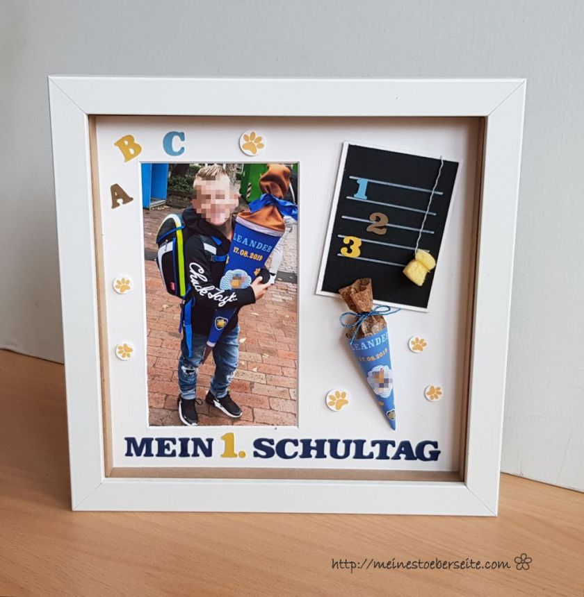 Vorgaben waren: Farbe Blau, Fotos, die selbstgemachte Schultüte der Mama in Mini, der Schulranzen und Kleinigkeiten, die mit Schule zu tun haben.