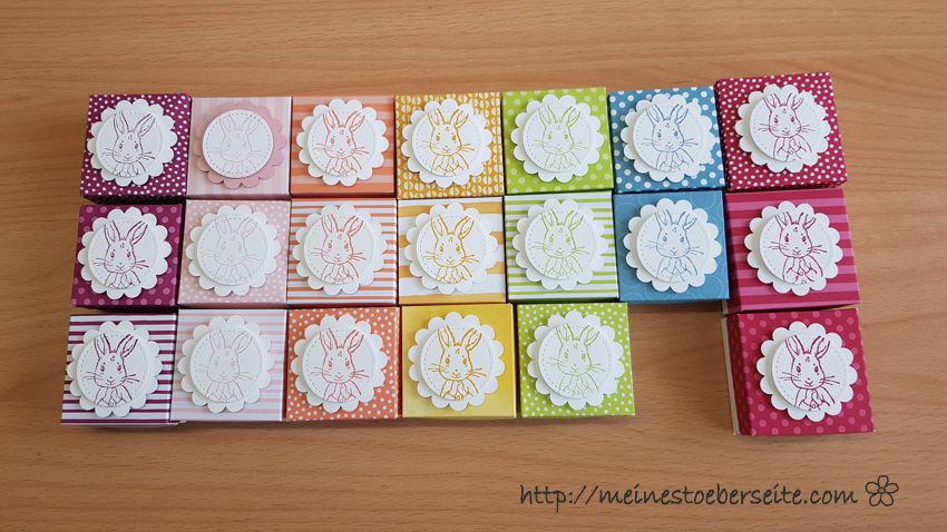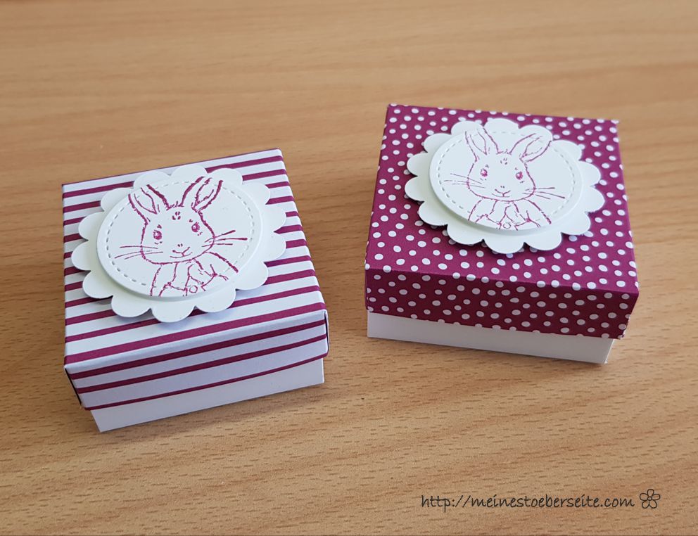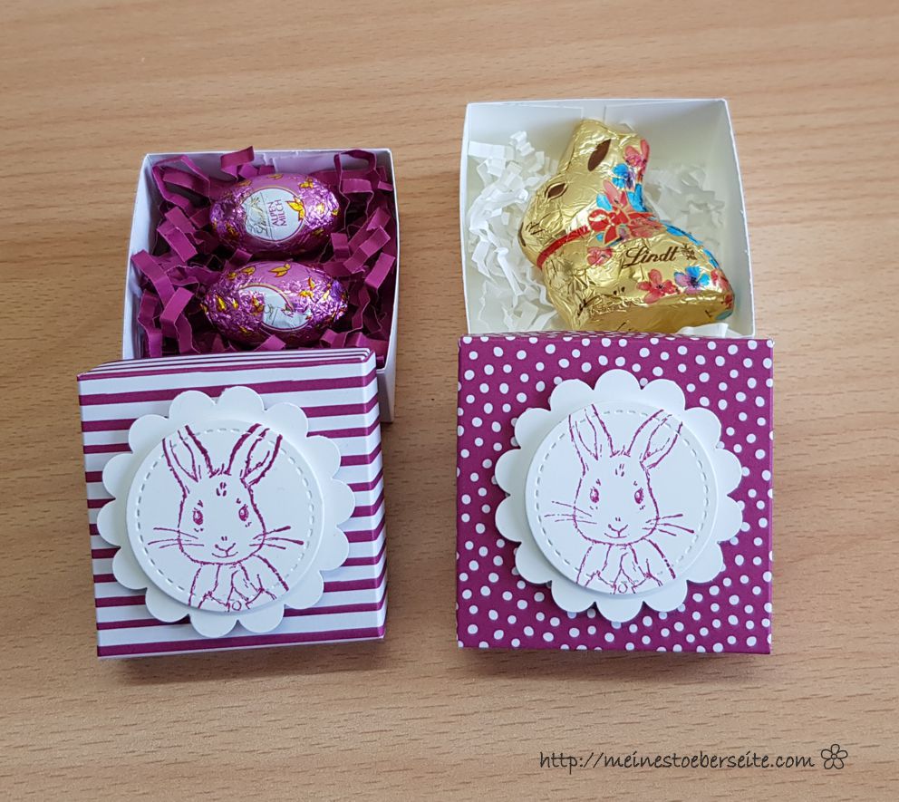 Hier drei kleine quadratische gegossene Behälter aus Raysin, gefüllt mit zwei kleinen Schokotäfelchen und einem kleinen Osterhasen.