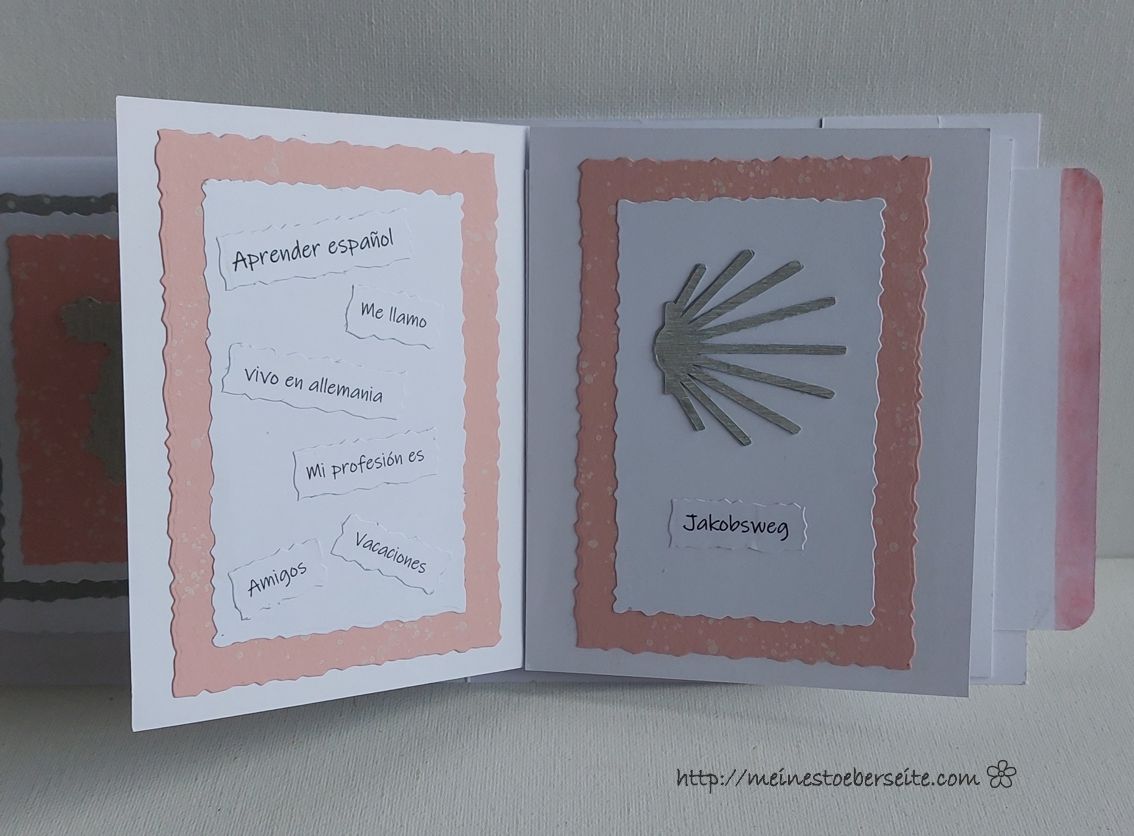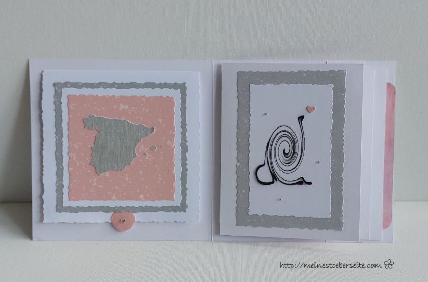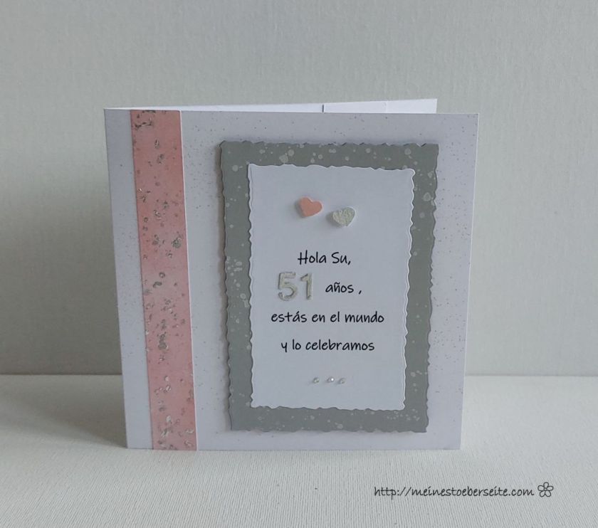 kein runder Geburtstag, aber viele interessante Themen und mal wieder in Anlehnung. ( Projekt 919 ) und da gefiel mir die Wasserfallkarte mal wieder am besten. Spanien, Hund (geschützt), Spanisch lernen, Jakobsweg, Sonne u. Klangschale. Farbwunch: Weiß. Rosa, Grau und Silber