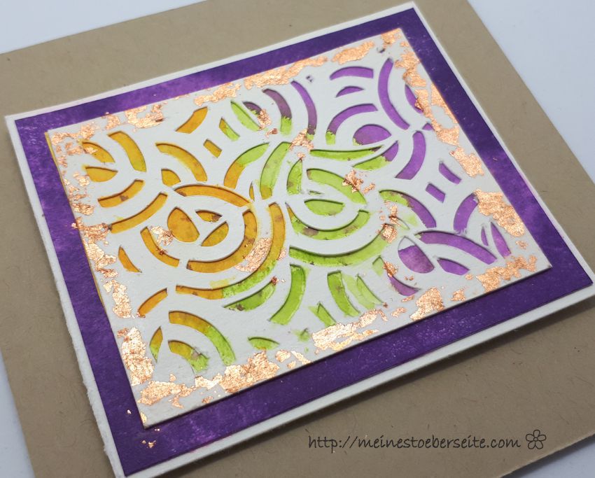 2. habe ich sie etwas zurecht geschnitten bzw. ausgestanzt, um sie in unterschiedlichen Höhen aufzukleben und in die frei gewordenen Lücken kamen dann die Kupferflocken.