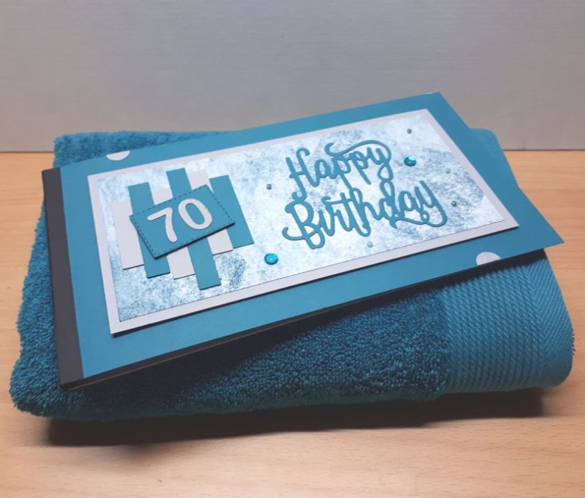 Ich sollte einen Wellness Gutschein zum 70.Geburtstag für einen Mann in eine Karte integrieren. Da der Umschlag mit dem Gutschein und Infomaterial sehr groß war, musste ich erst einmal überlegen und entschied mich für eine Buch ähnliche Karte. Jetzt ist Platz für Unterschriften und der Umschlag passt auch noch hinein.
