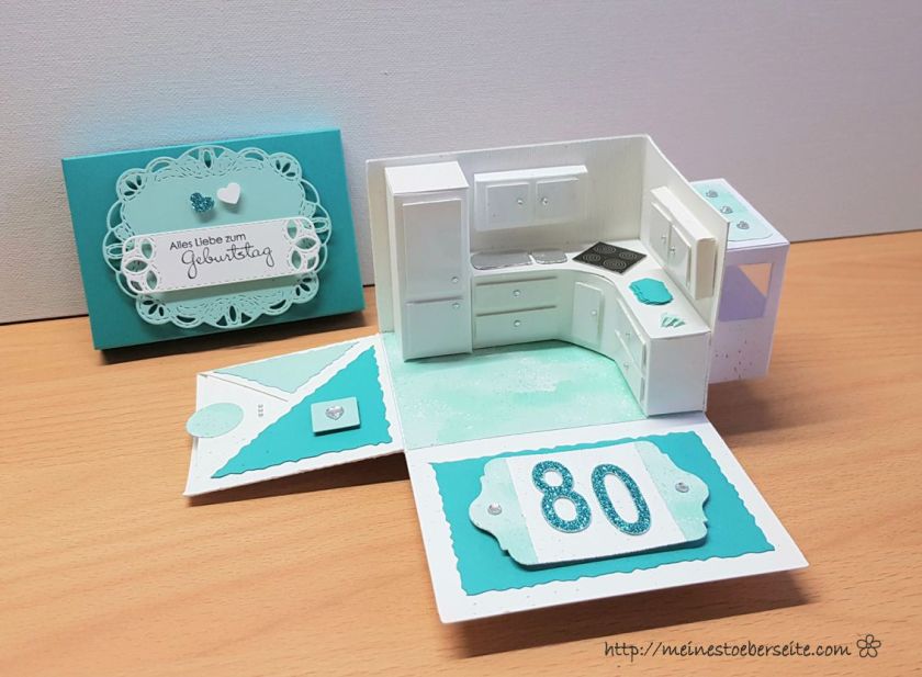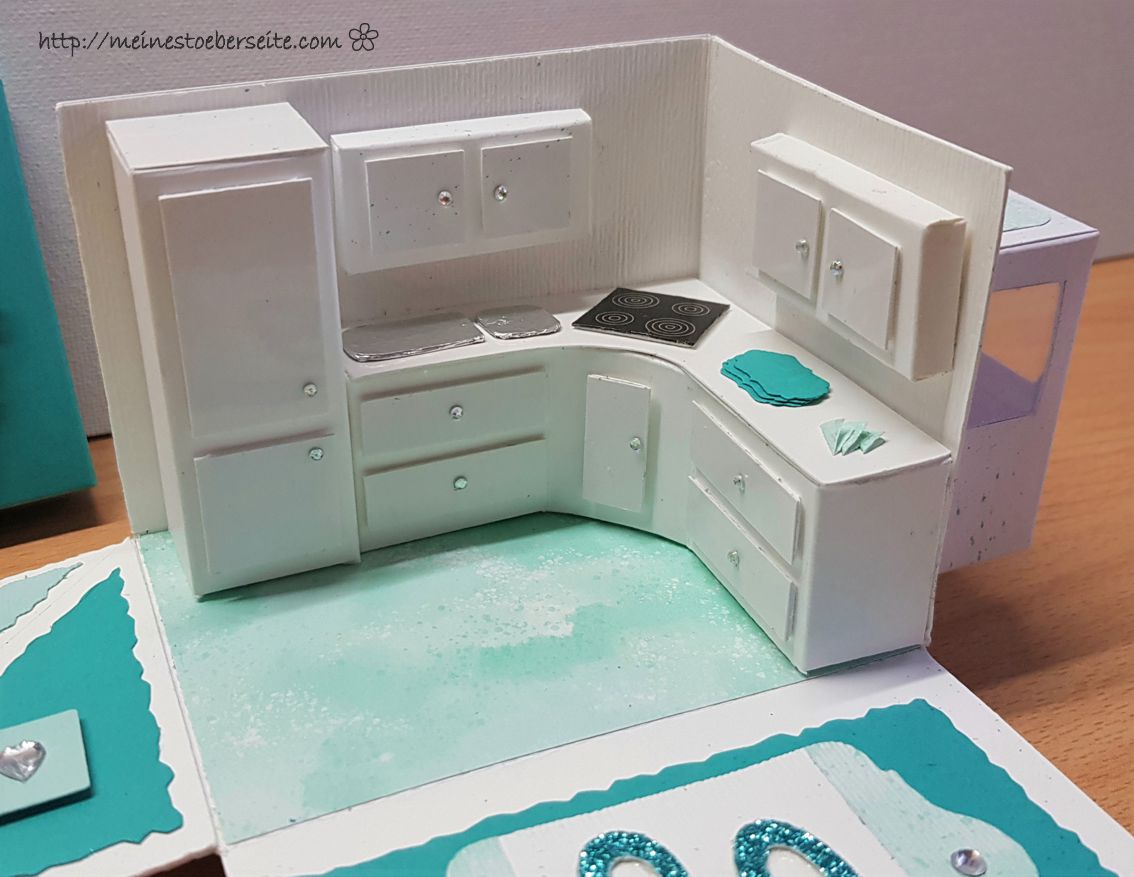 Zum 80.Geburtstag soll der Umzug der Küche in die neue Wohnung geschenkt werden. Farben Weiß/Türkis