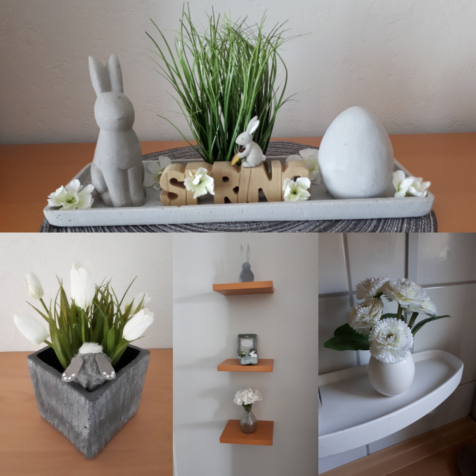 Die Porzellanhasen und die Kunstblumen hatte ich bei Depot gefunden.