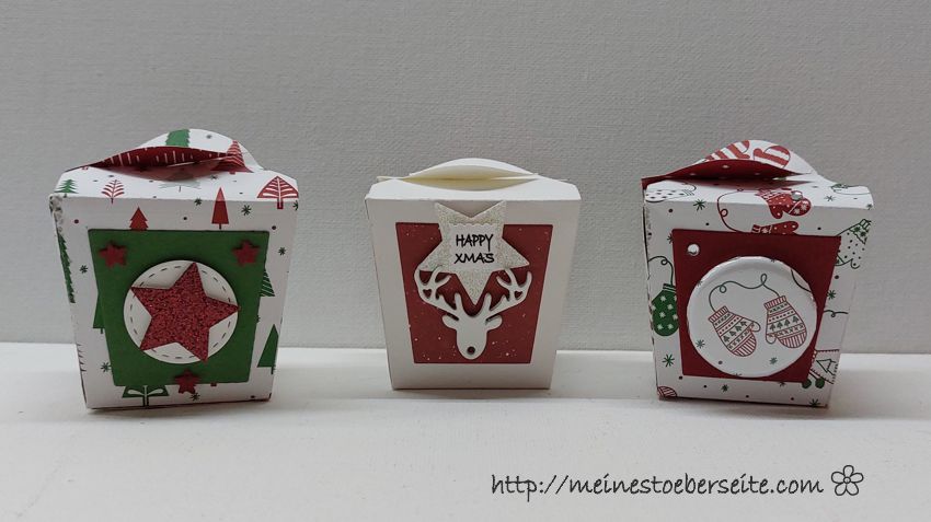 Die kleinen Schubfächer haben vorne eine Lasche zum herausziehen und darauf steht … Frohe Weihnachten.