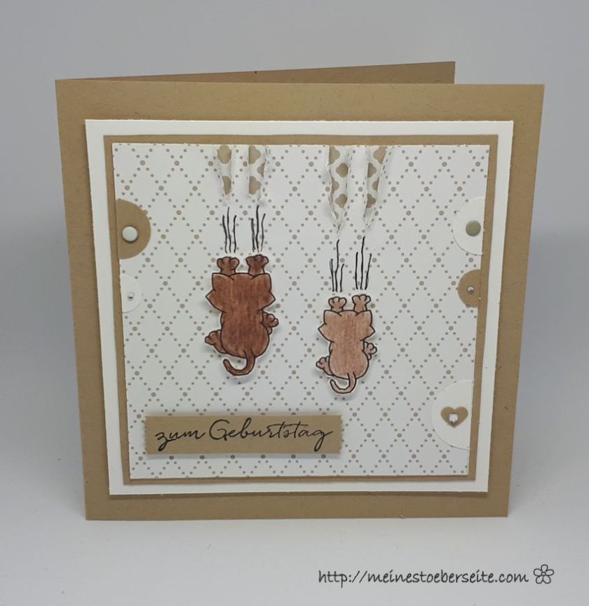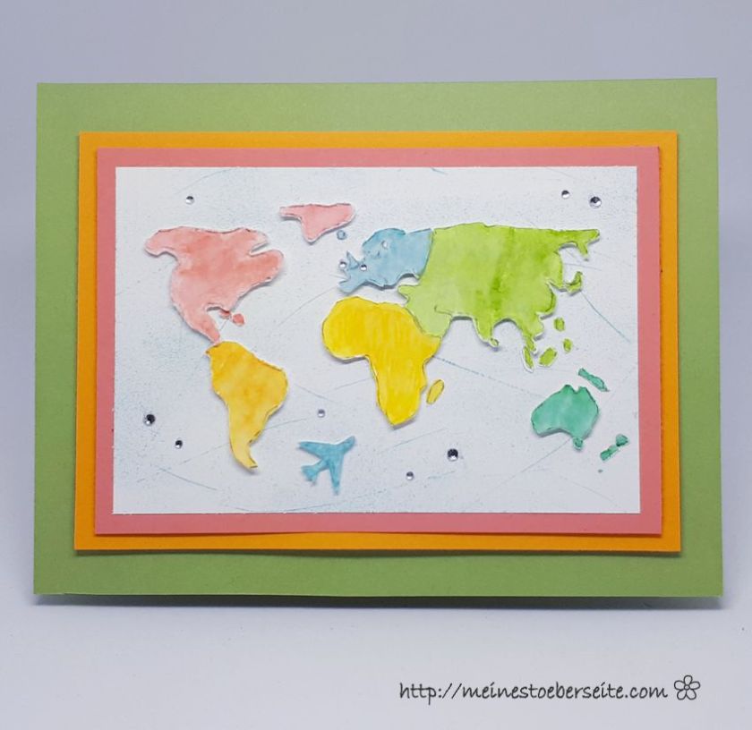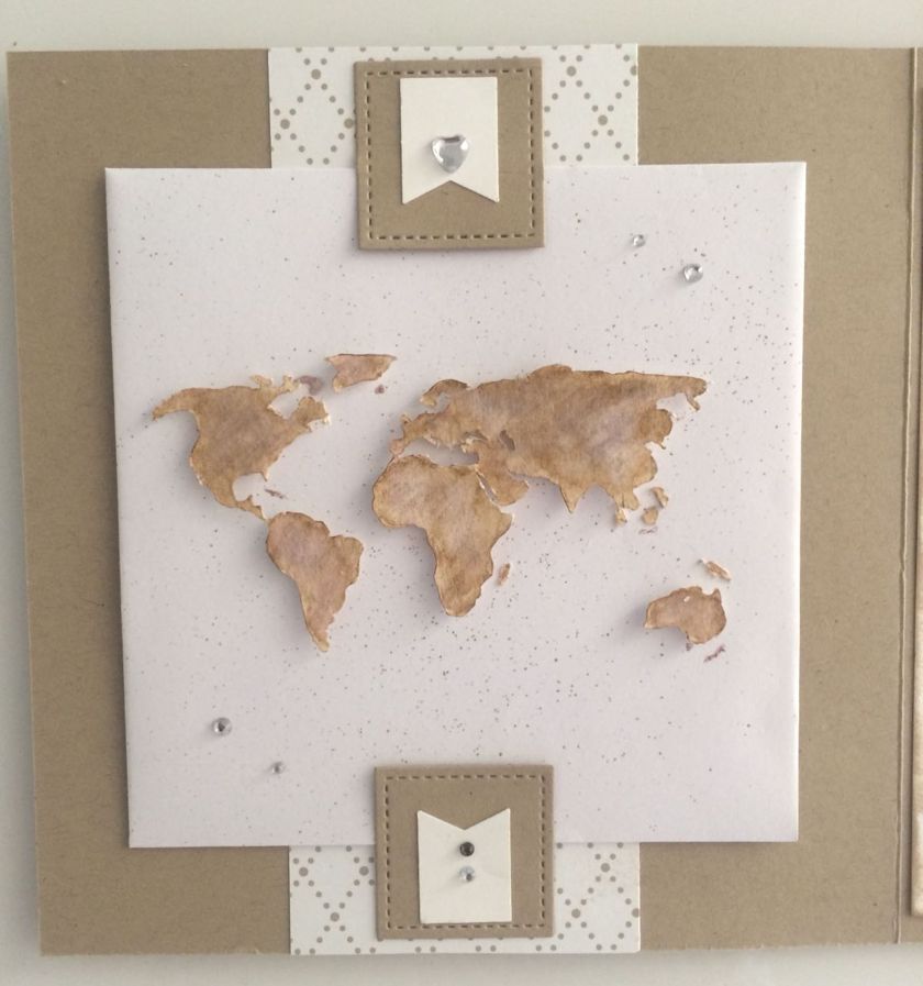 Zwei Katzen, in den Farben dunkel- und hellbraun und die demnächst anstehende Weltreise, sollten mit dieser Karte zum Ausdruck gebracht werden.