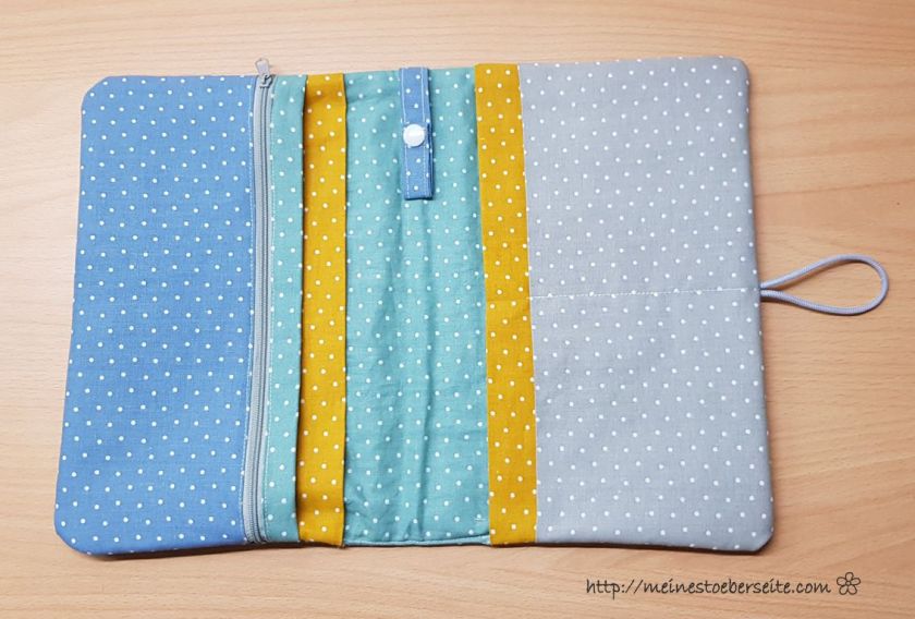 Die erste Windeltasche hat einen Druckknopfverschluss, aber die Idee mit Knopf und Kordel finde ich fast noch besser, da das Verschließen um Längen schneller geht.